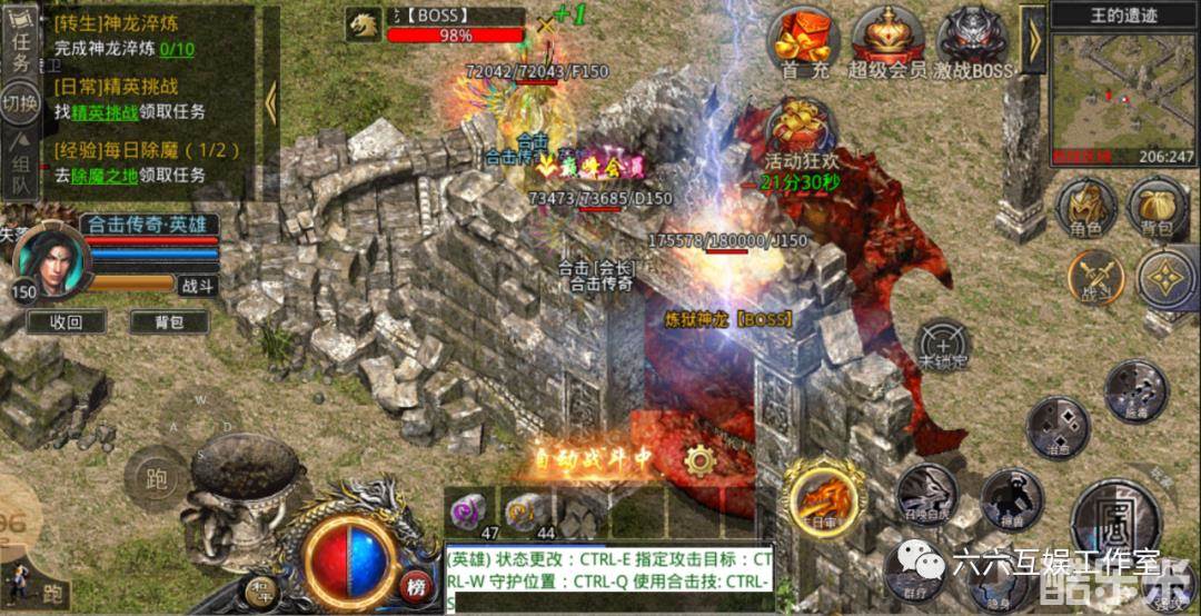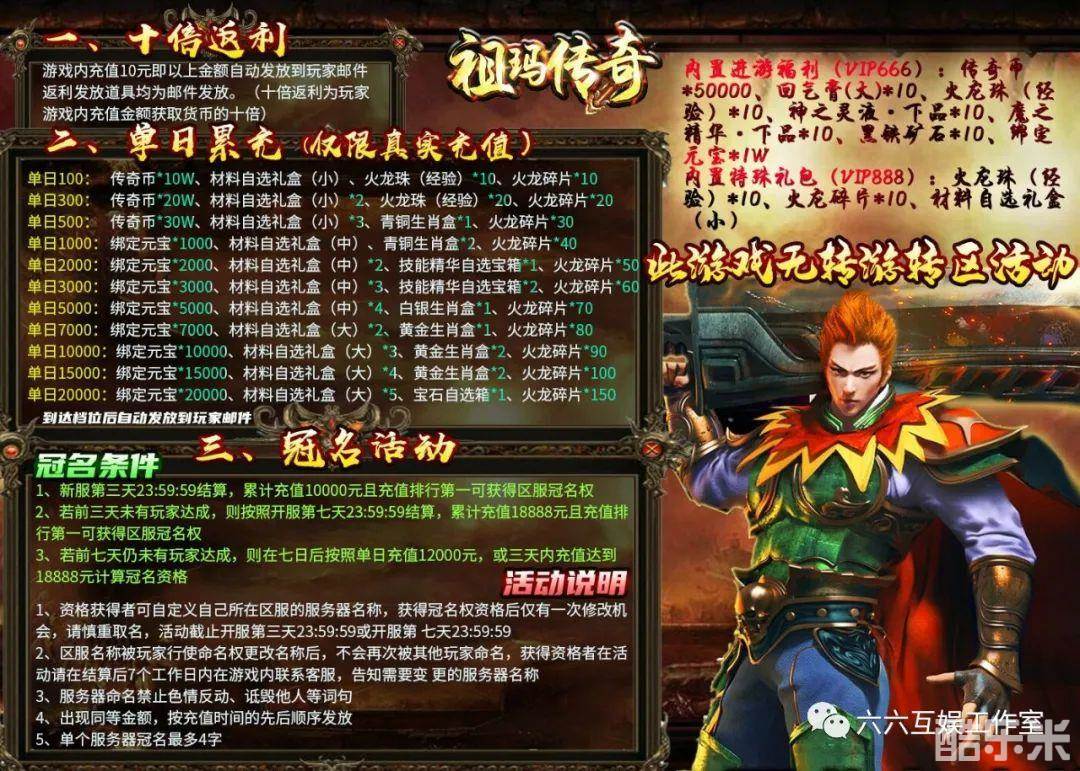 内置进游福利(VIP666):传奇币*50000、回气膏(大)*10、火龙珠(经验)*10、神之灵液·下品*10、魔之精华·下品*10、黑铁矿石*10、绑定元宝*1W