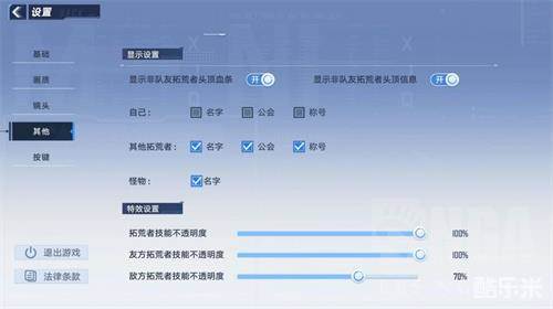 2、上图所示,我们将游戏设置的其他里面有一个友方拓荒者技能不透明度,默认是0,这个设置会导致你看不到队友技能效果,比如说奶圈。导致副本游戏体验贼差。把他拉到100%就行了。