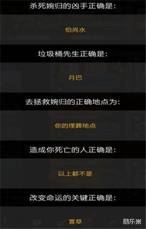 这里要用到迷先生的第三种能力,通过推理凶手手法得出婉归实际死亡时间在梁泰之前,所以对梁泰使用第三种能力,并不能拯救婉归。而能力不能对自己使用,婉芯的尸体找不到,所以只能选择林迟,而林迟的埋葬地点,老毛当时埋葬月巴时,有在确定埋葬地点,通过松柏树林和回忆时猫叔身上落下松柏树叶,以及老毛埋葬时再一边站了_会,放下一束黄白色的花,黄菊和白菊也就是葬礼送的花,确定是在将月巴埋在林迟旁边。