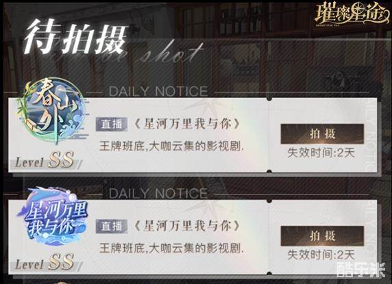 商务资源洽谈完毕之后,你需要转战“制作部”去进行节目录制啦,在制作部中,你会看到所有洽谈成功的通告,再依据通告单中的需求进行拍摄,每次最多可以同时拍摄三组通告。通告获得的收益,根据内容不同,会有艺人粉丝、金币、宣传卷等,越高级的通告获得的收益越多。所以,各位经纪人们,努力接取更多的S级通告吧!