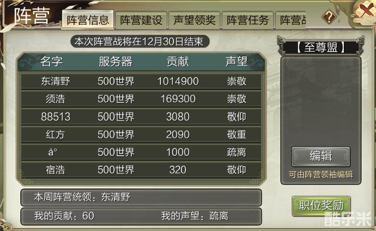 请注意:侠士部分阵营属性:阵营信息,阵营贡献,阵营声望等数值会以赛季进行计算。