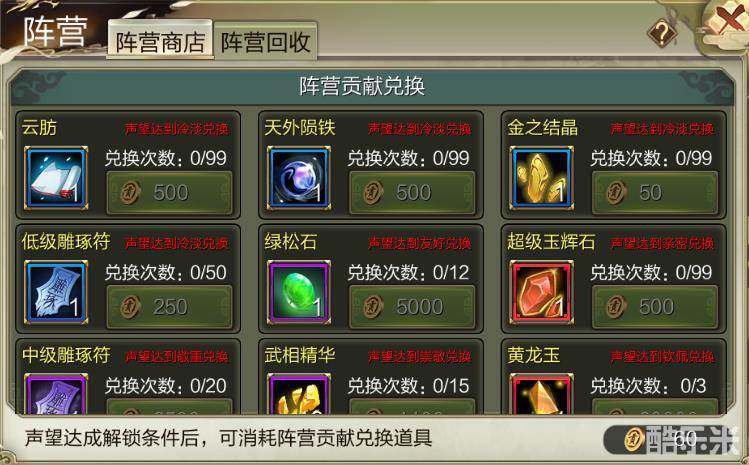 阵营商店:阵营商店的道具兑换需要声望达到目标阶段来解锁,解锁后可通过消耗阵营贡献来兑换道具,赛季内每个道具有兑换次数上限,请您合理分配阵营贡献。