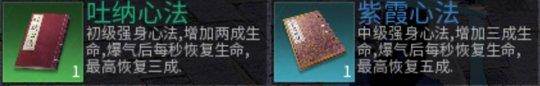 普通心法分为初级中级两个品阶级,吐纳心法为初级心法,紫霞心法为中级心法。习得初级心法可提供侠客两成生命值加成,中级可增加三成生命值。暴气后侠客身周气劲为紫色,初级可持续恢复最多三成生命值,中级心法可恢复最多五成生命值。