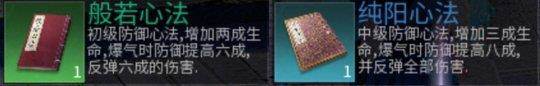 防御类心法中,般若心法为初级心法,纯阳心法为中级心法。习得初级心法可提供侠客两成生命值加成,中级可增加三成生命值。暴气后侠客身周气劲为蓝色,初级可提高侠客六成防御,并且后续反弹六成伤害,中级心法可提高侠客八成防御,并且气劲期间反弹全部伤害。