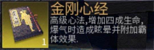 金刚心经为游戏内唯一高级心法,习得后可提供侠客四成生命值加成,暴气后侠客身周气劲为金色,可造成眩晕效果,气劲持续时间玩家将持续获得霸体效果,可以说是十分英霸!
