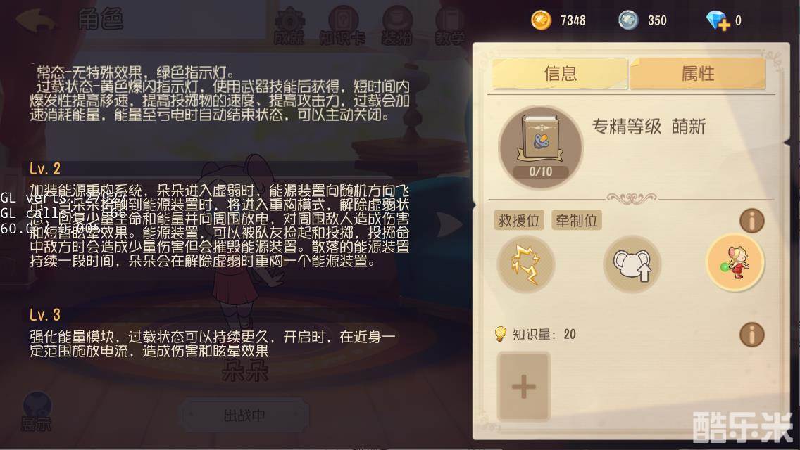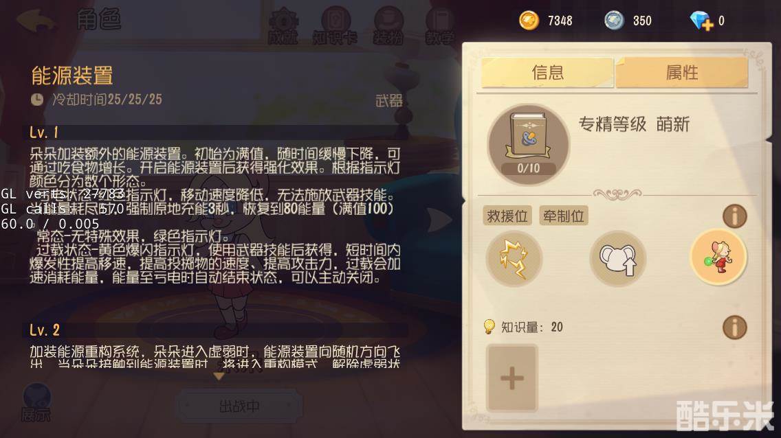 使用武器技能“能源装置”时,朵朵会加装额外的能源装置,能量会随时间缓慢下降,可以通过吃食物增长。当指示灯为红色时,朵朵缺少能源,将获得负面效果,能量耗尽后还将强制停留原地充能;指示灯为绿色时,无特殊效果;指示灯为黄色时,短时间内会获得强力的爆发效果,并加速消耗能量。