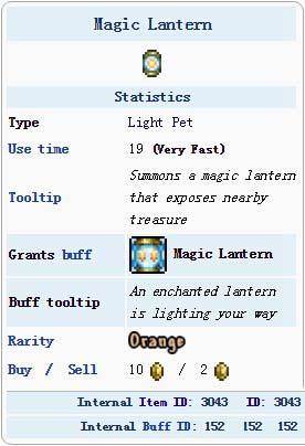 魔法灯笼是光源类宠物,需要使用同名物品魔法灯笼召唤,它可以会飘荡在玩家的前方上空,并且会在黑暗中提供光源。魔法灯笼可以探测到自身15格范围内的宝藏。
