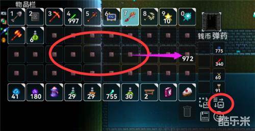 2、携带飞猪、虚空袋与钓鱼必要物品,将物品栏清空后使用垃圾占满所有背包栏位