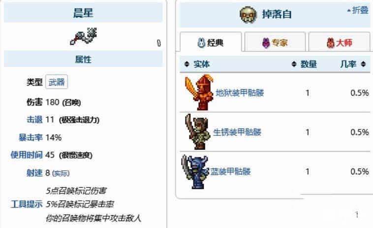 2、晨星鞭是由蓝色、生锈和地狱装甲骷髅掉落,当玩家在击杀蓝色、生锈和地狱装甲骷髅时,均有0.5%的概率掉落晨星鞭。
