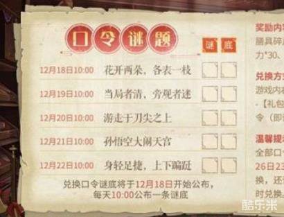 奖励内容(每条口令):膳具碎片·珍*10、体力*30、效率双倍符*3活动时间:2021年12月18日10:00至2021年12月26日23:59:59