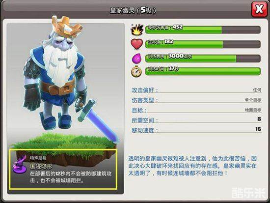 1、皇家幽灵是限时兵种,而且具有隐身的特点,可以无声息的前往建筑并且攻击,攻击和血量也还行
