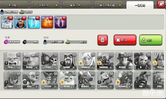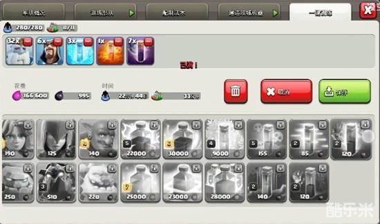 2、进攻兵种:4王+南瓜野蛮人*40、女武神*3、超级 蓝胖*1、隐身法术*2、治疗法术*1