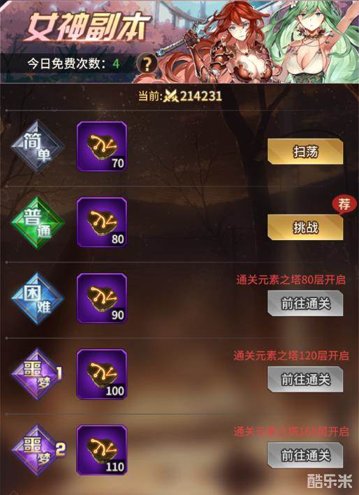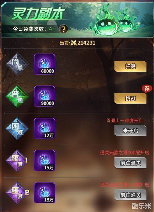 首先是我们每日需要完成的日常副本,提升战力材料的来源地,里面有灵力、金币、英雄、女神、装备副本以及后期的符文副本。每个副本下方都会有个一键扫荡的选项,点击可进行扫荡,花费一定的钻石,消耗免费扫荡和钻石扫荡的次数。需要通关元素之塔的层数提高开启的副本难度,获得的数量也随之增加。
