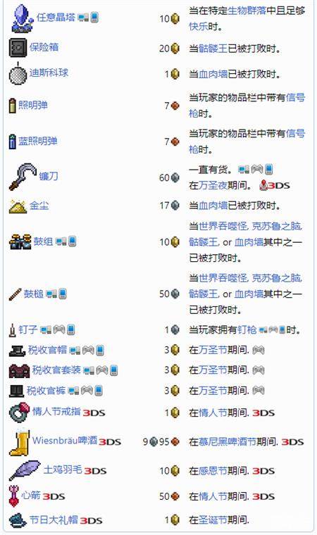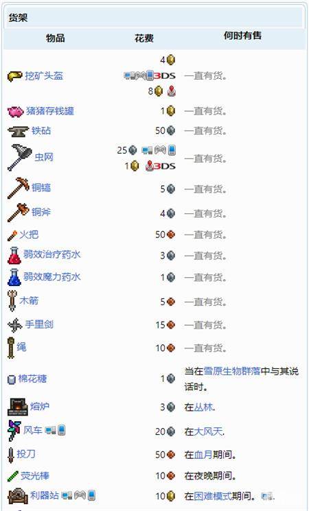 注意:以下所有物品的价格都可以通过装备优惠卡或贪婪戒指来降低。在电脑版和移动版上,价格还会基于 NPC 的快乐度程度而升降。
