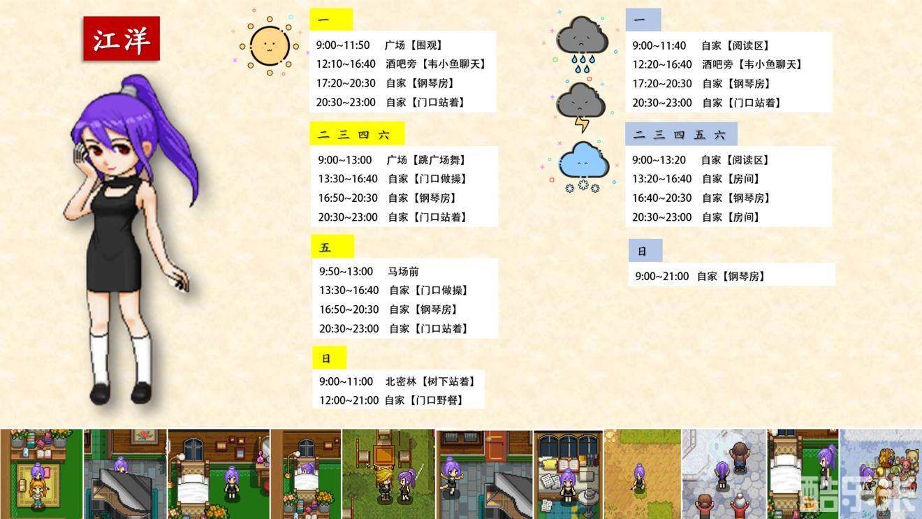 广场【围观】、酒吧旁【韦小鱼聊天】、自家【钢琴房】、自家【门口站着】、自家【门口做操】、北密林【树下站着】、自家【门口野餐】、自家【阅读区】、自家【房间】