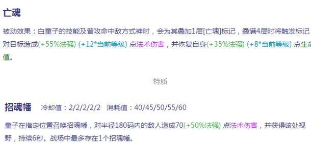 使用技巧 :先用1、3技能消耗敌方式神,然后通过2技能进场,利用2技能的加速调整好位置,配合1、4技能对残血目标进行收割,利用3技能伤害叠加的机制可对目标造成高额伤害。对线方面,白童子前期并不强势。主要是因为清线较慢,不易获取线权。白童子的技能伤害特点是高额百分比加成,基础数值偏低,他的前期相对没有那么强,因此白童子整体就是中后期强势的式神。白童子是一个范围高机动性的巫类式神,可以用普攻和技能给对方造成伤害的同时,利用移魂术可以轻松躲避敌方的技能和身位,而大招可以在团战中击飞敌方式神给团队赢得团战先机。