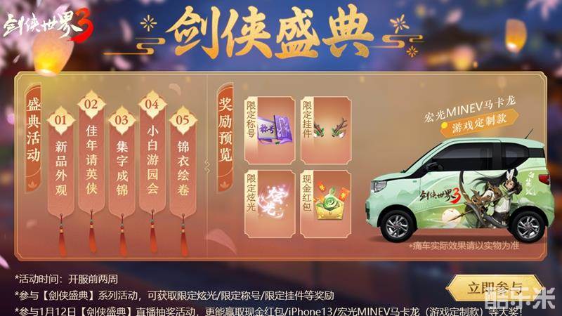 在剑侠狂欢夜中,每位拥有“剑侠狂欢夜抽奖券”的少侠,均有资格参与豪华大奖的抽取,赢取价值万元的剑侠世界3定制版五菱宏光mini、iPhone13等豪华大奖!除此之外,各位少侠还可以通过“佳年请英侠”活动,指定英侠送递拜帖,即可领取丰厚奖励和多重好礼!