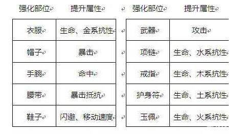 强化装备会提升该部位相对应的属性,提升的属性如下:
