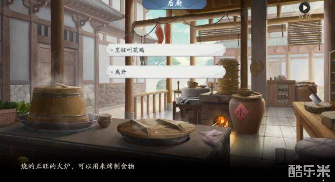 2、开启多个场景,点击三个闪光,与刘福生对话 进行了解3个菜的情况,制作叫花鸡,点击荷花池的闪光-得到荷叶,点击亭子旁边闪光点-得到泥土,去布衣街买鸡-集市,点击农田获得拾取到粟米,点击集市的屠夫获得鸡肉,回到后厨制作叫花鸡。