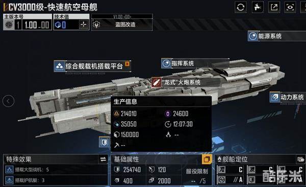 1.初始版本的CV3000可以装备五艘大型/中型战机和三艘护航艇,初始版本的CV3000载机量已经很可观,并且CV3000可以在低结构值时提高自身闪避率,生存能力较为优秀,造价也相对低廉,是个不需要模块平民也可以用的航母。