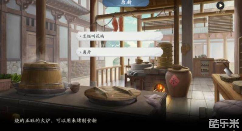 2.开启多个场景,三个闪光,与刘福生对话 进行了解3个菜的情况,制作叫花鸡,荷花池的闪光-得到荷叶,亭子旁边闪光点-得到泥土,去布衣街买鸡-集市,农田获得拾取到粟米,集市的屠夫获得鸡肉,回到后厨制作叫花鸡。