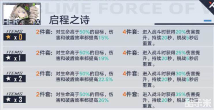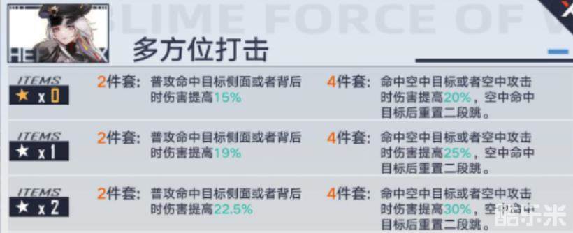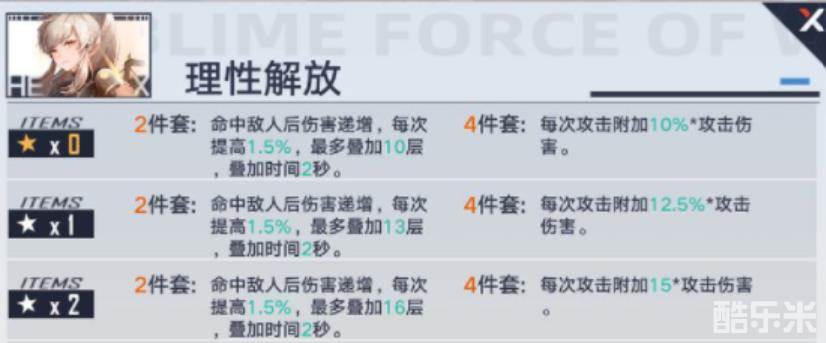 2件套:命中敌人后伤害递增,每次提高1.5%,最多叠加10/13/16/20层,叠加时间2秒。