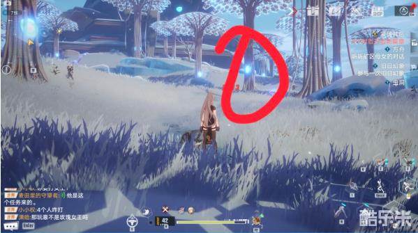 上图这些蓝色的像树的就是原能树,途中圈出来的每棵树都有,正常为发出蓝光,如果原能树是红光就可以靠近与原能树对话,消耗相应的材料修好原能树就可获取一枚黑核(又是新的黑核获取途径,呜呼,上线冲鸭虽然我10页黑核无金....)