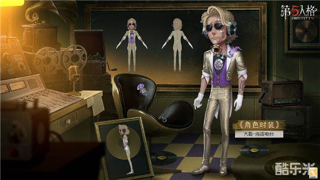 大副-海盗电台身着金色白格子燕尾服和西裤,胸口装载着一张炫彩的黑胶唱片;他的手臂上镶嵌着推钮,耳麦、唱针和话筒也与躯体相融,左边脸更是露出了内里的金属材质。