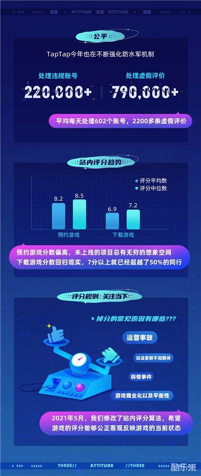TapTap 的评价一直是游戏口碑风向标,为了更真实地反应玩家的声音,提升平台信誉度。TapTap 进行过一次改动较大的评分算法优化,更加强调最新版本的游戏品质,提升了游戏时间更长的老玩家的评分权重。简而言之,当玩家游玩某款游戏的时间越长,发表的评价越新,其对评分的影响越大。同时平台也通过一套强有力的防水军算法,今年以来,TapTap官方累积处理了22万个违规账号,以及79万条的虚假评价。