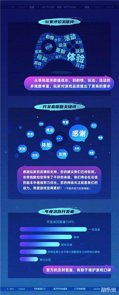 在具体的评价上,TapTap 用户的发言集中在“体验、活动、福利、更新、剧情、策划“等关键词,而开发者的发言关键词则为“感谢、支持、优化、更好、希望、抱歉”等。可见玩家对游戏品质、福利以及体验带来的满意度等方面比较关注;厂商也对用户的口碑极为重视,不仅互动频繁,各种礼貌用语也高居用词榜首。