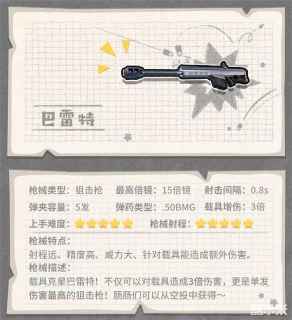 1、巴雷特是游戏中单发伤害最高的狙击枪,暂时只能在空投箱里得到。