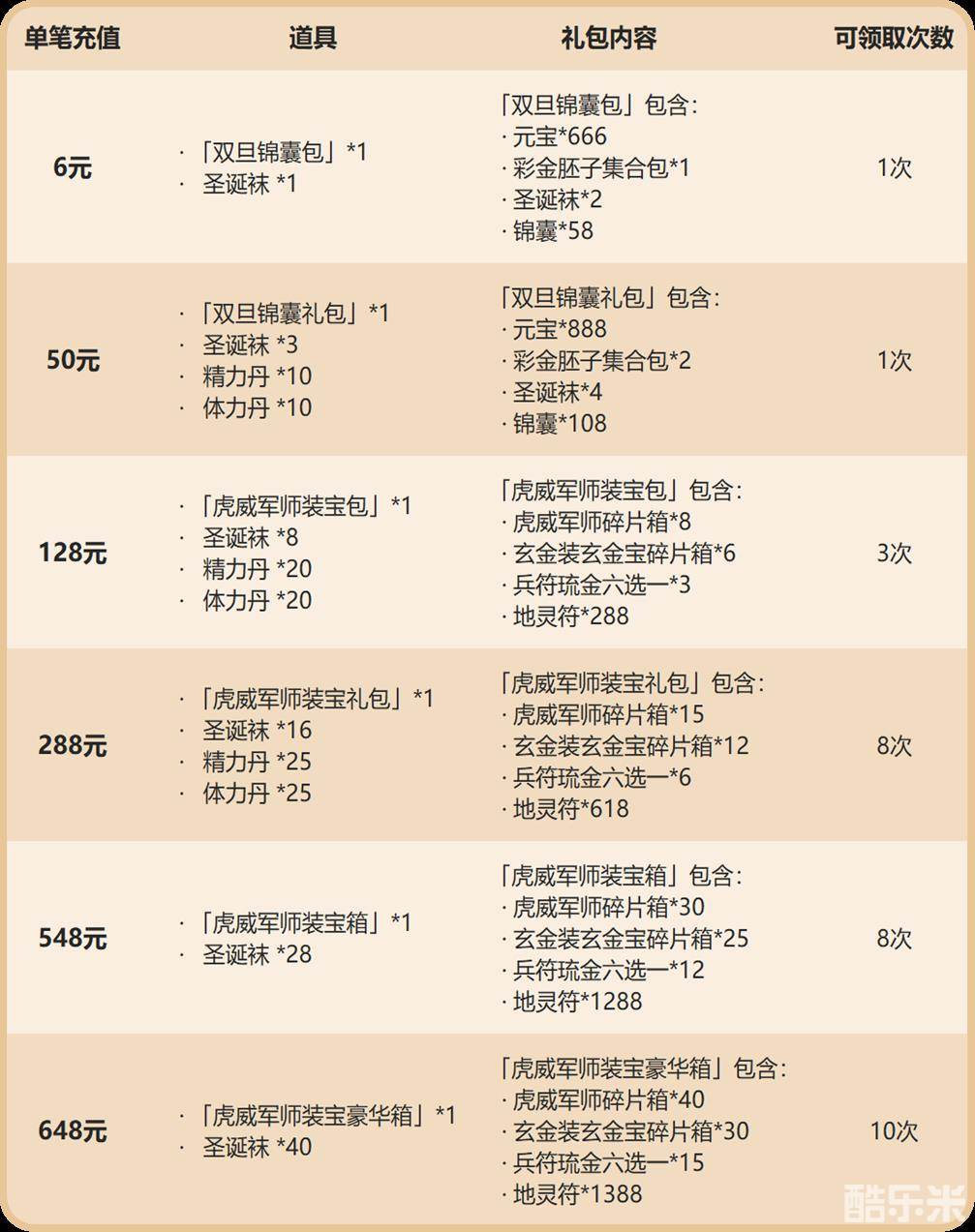 在活动期间少年们单笔充值指定金额,即可获得虎威军师碎片箱、玄金装玄金宝碎片箱、兵符琉金六选一、地灵符、圣诞袜等资源: