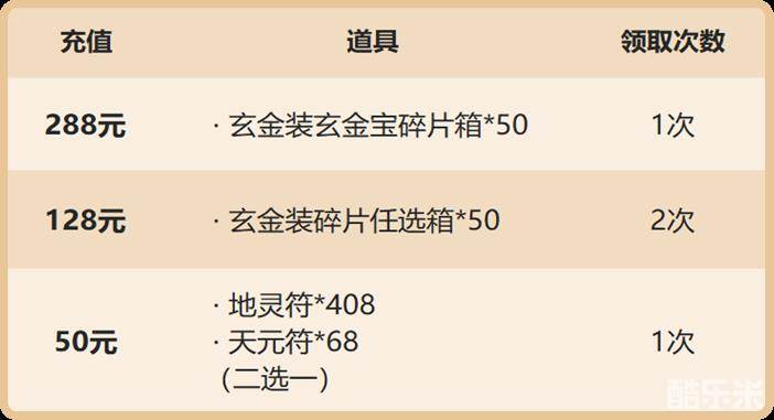 少年们单笔充值指定金额,即可得到玄金装玄金宝碎片箱、天元符等珍稀资源,少年们千万不要错过哟~