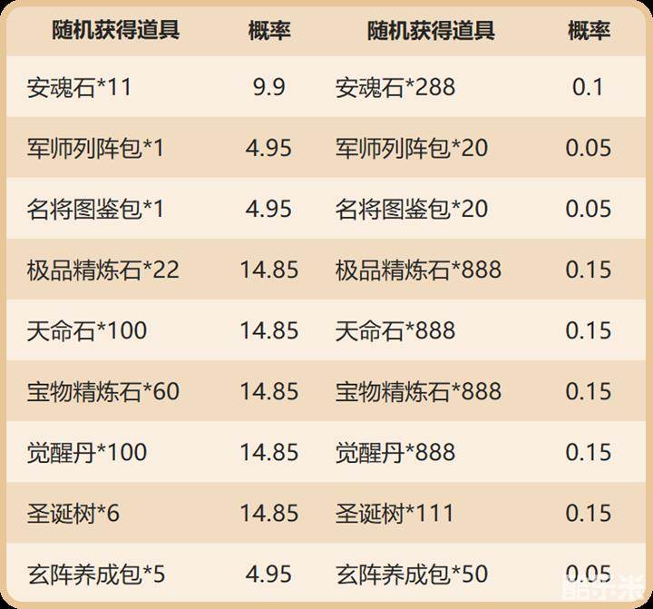 3.「双旦礼盒」可开出:圣诞树*111、玄阵养成包*50、觉醒丹*888、天命石*888、极品精炼石*888、安魂石*666、军师列阵包*40、名将图鉴包*40、宝物精炼石*888、圣诞树*6、玄阵养成包*5、觉醒丹*100、天命石*100、极品精炼石*22、安魂石*11、军师列阵包*1、名将图鉴包*1、宝物精炼石*60中的随机1种。