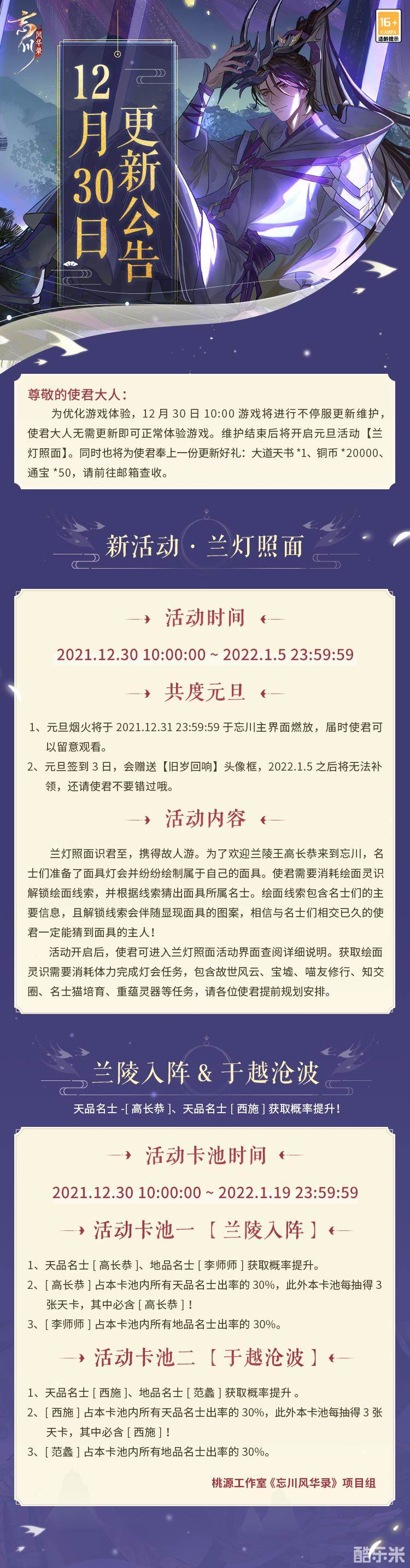 为优化游戏体验,12月30日10:00 游戏将进行不停服更新维护,使君大人无需更新即可正常体验游戏。