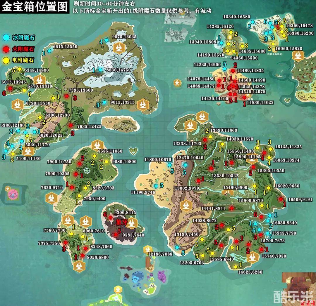 1、下图所标金宝箱开出附魔石数量仅供参考,具体以实际开出为准,大家按照小编提供的金宝箱坐标就能轻松找到了。