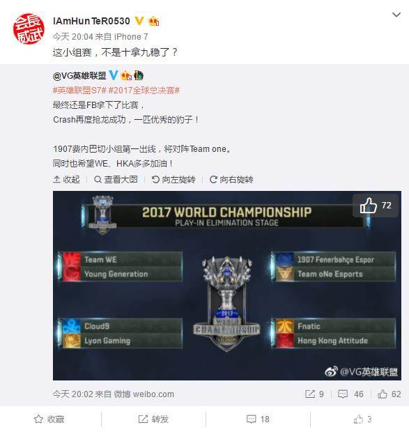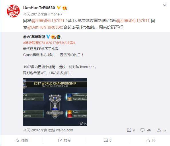 VG俱乐部CEO(微博ID:IAmHunTeR0530)看到这个抽签结果后发表了言论——