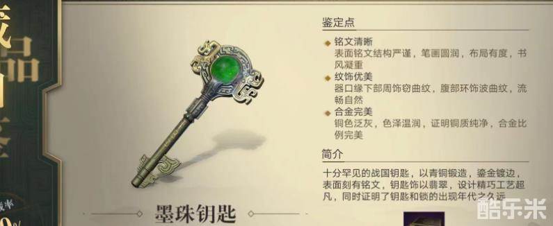 玩家进入游戏后可以在藏品中查询到目前所拥有的所有产品信息。其中包括墨珠钥匙道具,墨珠钥匙,是十分罕见得战国钥匙,主要是由青铜锻造而成,鎏金渡边,表面刻有铭文,钥匙装饰翡翠,设计精巧工艺非凡,同时可以证明了钥匙和锁得出现年代之久远。墨珠钥匙可以通过主线任务,龙脉寻宝,潘家园活动获得。