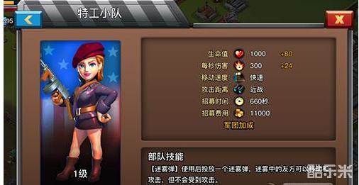 特工小队,M国阵营1200奖杯精锐部队。具备投放烟雾战场隐蔽的功能。战斗力强,可在紫色烟雾中直冲敌方大本营。战斗效率高。是很多高阶玩家的最爱。不过,相对于其他兵种而言,特工女神们算是操作难度系数较高的部队,对玩家操控能力,作战规划要求高,在操作能力不足的情况下战斗损失和兵种消耗也会相对较大。