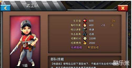 Z国特有兵种,熟悉抗战历史的玩家对他肯定不会陌生,特别是华北地区的玩家们。与特工小队不同的是,武工队专长地下行走。挖的一手好地道!战斗力相对来说较特工小队弱一些。但技能发出后的地道神行倒不失为有趣的观感体验。