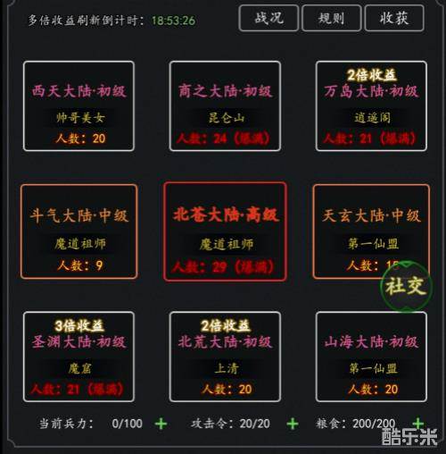 大量的硬通货-仙缘奖励产出。这里是大小帮派秀实力的副本,实力越强的帮派可以占据的资源更好,奖励也就更丰富。通过占据、挑战、击退外人,达到占领大陆的成就,便可以享受大陆的资源产出。