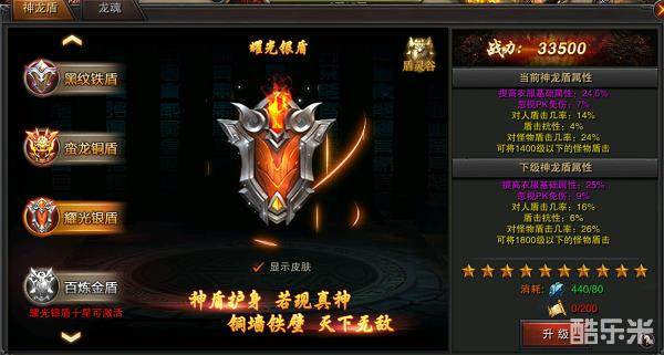 神龙盾升星需要消耗盾灵石,升阶需要消耗神龙盾碎片和神龙盾图纸,提升后可极大提升自身抗性和战力。