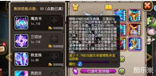 寓言书(大招):牺牲45%的当前生命值,艾雪拉让全场除自己外的所有单位损失50%的当前生命值。在之后的数秒内,我方所有单位生命值每秒持续回复损失生命值7%,敌方则持续回复3.5%。该技能在永生梦境、团队副本、天空要塞以及诸神争霸模式下,对敌我生命值损失上限为技能等级的250倍。