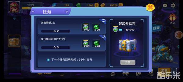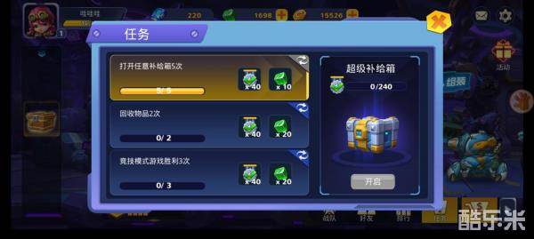 任务都很简单,玩一玩就能完成,完成后可以领取能量方块和小奖杯,小奖杯攒够后可以开启右侧的超级补给箱(里面好货很多)所以说玩游戏的时候要尽量把任务做完。