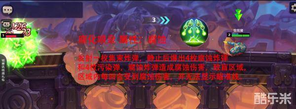 发射一枚集束炸弹,静止后爆出4枚腐蚀炸弹和4枚污染弹,腐蚀炸弹造成腐蚀伤害,致盲区域,区域内每回合受到腐蚀伤害,并无法显示瞄准线。