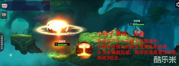 命中后产生一次超大范围爆炸,对爆炸范围内的战车造成热能伤害,并生成辐射区域,每回合造成腐蚀伤害,持续3回合。