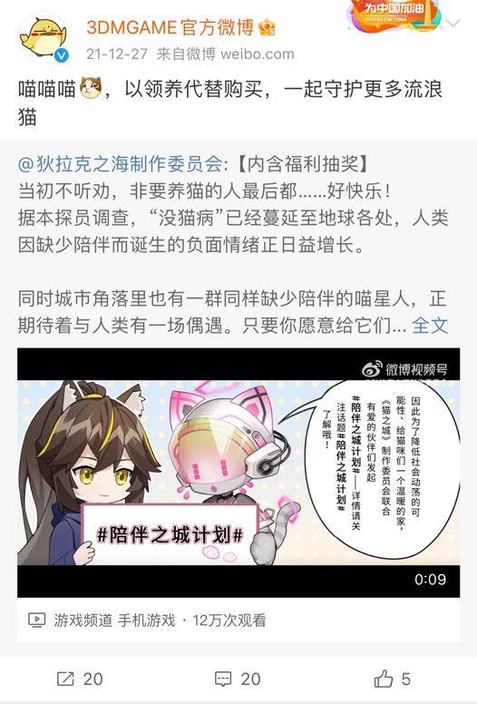 除了狄拉克之海与猫之城手游、猎奇宠物粮 三方的本家平台以外,陪伴之城计划“以领养代替购买”的核心主旨对流浪猫咪的善意,也引来了无数社会媒体的自发传播。其中包括游侠网、游民星空、3DMGAME、Chinajoy、邻宠等来自不同领域的影响力媒体。此外,无数爱猫人士受此影响,也都纷纷通过加入话题与转发、评论的方式自发进行扩散。这既鼓舞了主办三方的小伙伴们,也使得陪伴之城计划对流浪猫咪的善意,成为了一种巨大的社会正能量传播。