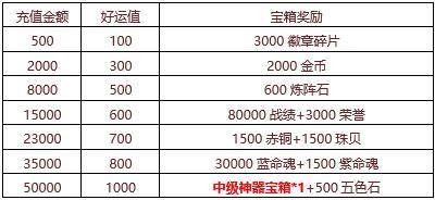 【活动内容】活动期间可通过充值金币获得好运值,积累好运值即可打开宝箱奖励,闪耀称号,全新神器,绝对超值的提升战力资源,尽在特惠好礼。