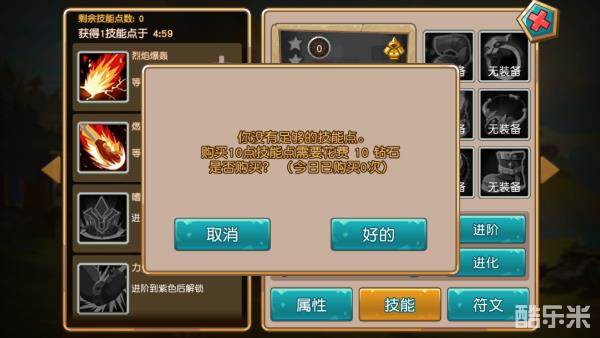 购买英雄技能点:技能点为0时可以直接通过钻石增加。
