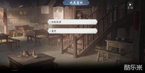 5、进入玄机街捡起右下角闪光点(金币),进入鸠花客栈,捡起桌面面条(资源),点击柜台闪光点接取任务:四处张望;